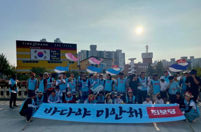Ä·ÆäÀο¡ Âü¿©ÇÑ Áøº¸´ç 60¿©¸íÀÇ ´ç¿øµéÀº µµÃ»ÀÔ±¸ »ç°Å¸®¿Í ¹é³â´ë·Î¿¡ ÁÙÁö¾î¡®¹Ù´Ù¾ß ¹Ì¾ÈÇØ¡¯, ¡®À±ÅðÁø ¿øÇÏ´Â ¹Ù´Ù¡¯µîÀÇ Çö¼ö¸·°ú °í·¡¸ð¾çÀÇ ÇÇÄÏÀ» µé°í Áö³ª°¡´Â Â÷·®°ú ½Ã¹Îµé¿¡°Ô ¼ÕÀ» Èçµé°í ÀλçÇϸç ÈÄÄí½Ã¸¶ ÇÙ¿À¿°¼ö ÇØ¾çÅõ±â ¹Ý´ëÀÇ ¸ñ¼Ò¸®¸¦ ³ô¿´´Ù.