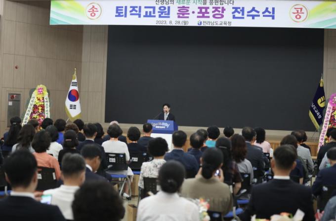 [È£³²´º½º¶óÀÎ = ¼ÀºÈ« ±âÀÚ] Àü¶ó³²µµ±³À°Ã»(±³À°°¨ ±è´ëÁß)ÀÌ 8¿ù 28ÀÏ(¿ù) û»ç ´ëȸÀǽǿ¡¼ 2023³â 8¿ù¸» ÅðÁ÷±³¿ø ÈÆ¡¤Æ÷Àå Àü¼ö½ÄÀ» °³ÃÖÇß´Ù.