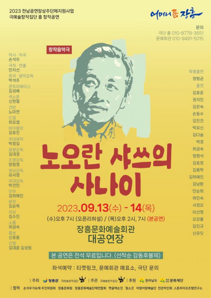 ÀåÈ﹮ȿ¹¼úȸ°ü¿¡¼ ¿¸®´Â À̹ø °ø¿¬Àº ÀåÈﱺ°ú ±Ø¿¹¼úâÀÛÁý´Ü ÈïÀÌ ÁÖÃÖÇϰí, Àü¶ó³²µµ, Àü³²¹®ÈÀç´ÜÀÌ ÈÄ¿øÇÑ´Ù.¡®³ë¿À¶õ »þ¾²ÀÇ »ç³ªÀÌ¡¯ °ø¿¬Àº ÀåÈïÀÌ ³ºÀº ÇÑ·ù 1È£ ÀÛ°î°¡ °í ¼Õ¼®¿ì ¼±»ýÀÇ À½¾Ç°ú Àλý¿¡ ´ëÇÑ À̾߱⸦ ±ØÈ½ÃŲ âÀÛÀ½¾Ç±ØÀÌ´Ù.