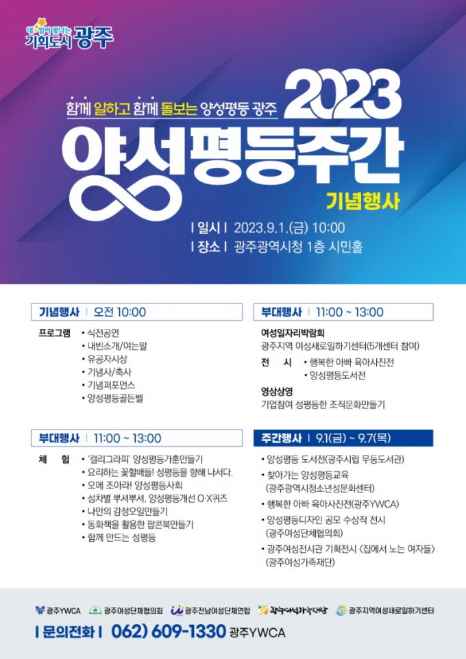 9¿ù 1ÀϺÎÅÍ 7ÀϱîÁö ¾ç¼ºÆòµî±â³äÁÖ°£¿¡ ¾ç¼ºÆòµî µµ¼Àü(½Ã¸³¹«µîµµ¼°ü), ã¾Æ°¡´Â ¾ç¼ºÆòµî±³À°(±¤ÁÖû¼Ò³â¼º¹®È¼¾ÅÍ), ÇູÇÑ ¾Æºü À°¾Æ»çÁøÀü(±¤ÁÖYWCA), ¾ç¼ºÆòµîµðÀÚÀÎ °ø¸ð ¼ö»óÀÛ Àü½Ã(±¤ÁÖ¿©¼º´ÜüÇùÀÇȸ), ±¤ÁÖ¿©¼º°¡Á·Àç´Ü ¿©¼ºÀü½Ã°ü ±âȹÀü½Ã(Áý¿¡¼ ³ë´Â ¿©ÀÚµé) µî ´Ù¾çÇÑ Çà»ç°¡ ¿¸°´Ù.