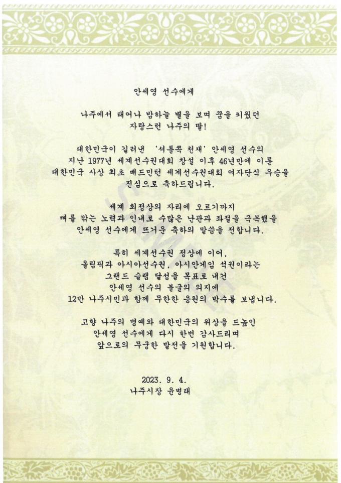 À±º´Å ³ªÁÖ½ÃÀåÀÌ ÃÖ±Ù ¼¼°è¹èµå¹ÎÅϼ±¼ö±Ç ´ëȸ ¿ì½ÂÀ» Â÷ÁöÇÑ ¾È¼¼¿µ ¹èµå¹ÎÅÏ ±¹°¡´ëÇ¥¿¡°Ô ÃàÀüÀ» º¸³Â´Ù. À± ½ÃÀåÀº ÃàÀü¿¡¼ ¡°¼¼°è ÃÖÁ¤»óÀÇ ÀÚ¸®¿¡ ¿À¸£±â±îÁö »À¸¦ ±ð´Â ³ë·Â°ú Àγ»·Î ¼ö¸¹Àº ³°ü°ú ÁÂÀýÀ» ±Øº¹ÇßÀ» ¾È¼¼¿µ ¼±¼ö¿¡°Ô ¶ß°Å¿î ÃàÇÏÀÇ ¸»¾¸À» ÀüÇÑ´Ù¡±°í ÀüÇß´Ù.