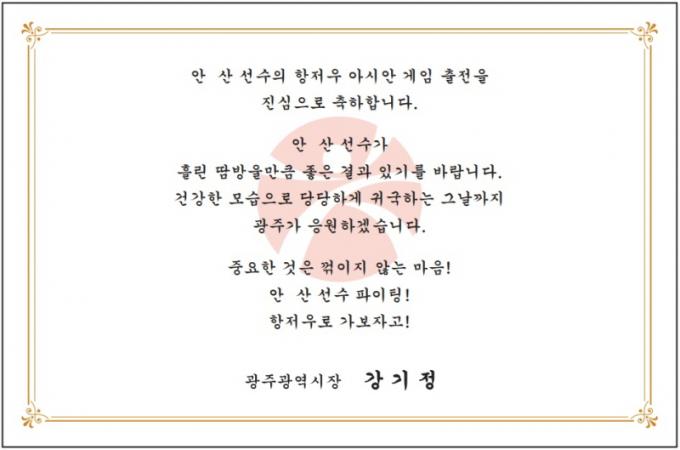 °±âÁ¤ ±¤ÁÖ±¤¿ª½ÃÀåÀÌ Ç×Àú¿ì ¾Æ½Ã¾È°ÔÀÓ ÃâÀü ±¤Áֽà ¼Ò¼Ó ±¹°¡´ëÇ¥ ¼±¼öµé¿¡°Ô ÀÀ¿øÀÇ ÆíÁö¸¦ º¸³Â´Ù.