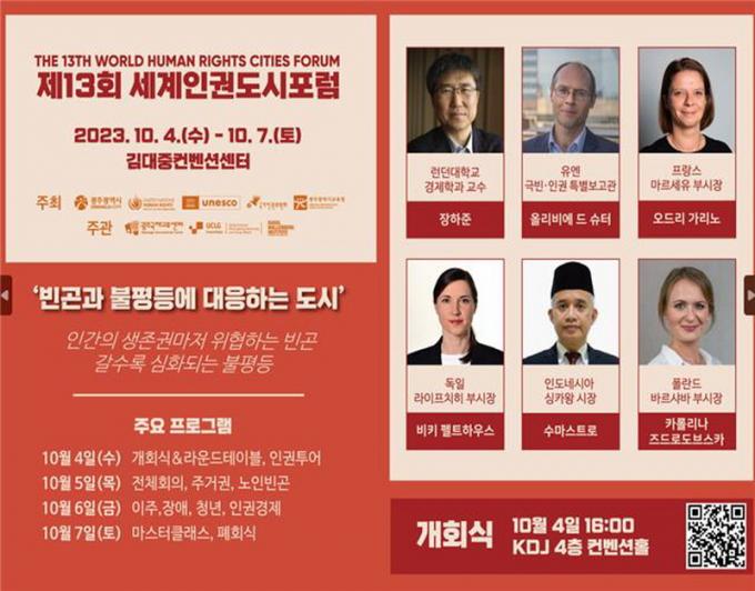 ±¤ÁÖ±¤¿ª½Ã(½ÃÀå °±âÁ¤)´Â À¯¿£ ÀαÇÃÖ°í´ëÇ¥»ç¹«¼Ò, À¯³×½ºÄÚ, ±¹°¡ÀαÇÀ§¿øÈ¸, ±¤Áֽñ³À°Ã»°ú °øµ¿À¸·Î ¿À´Â 10¿ù 4ÀϺÎÅÍ 7ÀϱîÁö ±è´ëÁßÄÁº¥¼Ç¼¾ÅÍ¿¡¼ ¡®Á¦13ȸ ¼¼°è Àαǵµ½ÃÆ÷·³¡¯(ÀÌÇÏ ±¤ÁÖÆ÷·³)À» °³ÃÖÇÑ´Ù. ¿ÃÇØ ÁÖÁ¦´Â ¡®ºó°ï°ú ºÒÆòµî¿¡ ´ëÀÀÇÏ´Â µµ½Ã(Human Rights Cities Responding To Poverty And Inequalities)¡¯ÀÌ´Ù.