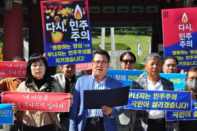 ±×´Â ¡°À±¼®¿ Á¤±ÇÀÇ °ËÀº ¾ß¿åÀ» ºÐ¼âÇÏ°í ÆÄź ³ ¹Î»ý°ú ¹ÎÁÖÁÖÀǸ¦ »ì¸®±â À§ÇØ °Å¸®¿¡ ³ª°¡ ±¤Áֽùβ² ¹®Á¦ÀÇ ½É°¢¼ºÀ» ¾Ë¸®°Ú´Ù.¡±¸ç ¡°ÀÏÀÎ ÇÇÄϽÃÀ§¸¦ ½ÃÀÛÀ¸·Î ÇÔ²² ½Î¿ö³ª°¡°Ú´Ù.¡±°í ¹àÇû´Ù.
