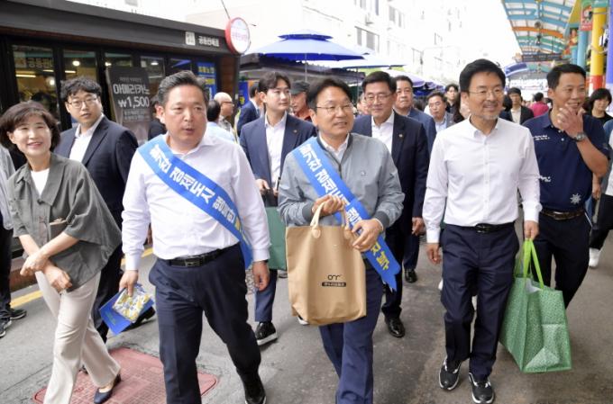 °±âÁ¤ ±¤ÁÖ±¤¿ª½ÃÀåÀÌ Ãß¼® ¸íÀýÀ» ¾ÕµÎ°í ¹Î»ý Çຸ¿¡ Àü³äÇϰí ÀÖ´Ù. ° ½ÃÀåÀº 26ÀÏ ¿ÀÀü ±¤ÁÖ ³²±¸ ºÀ¼±½ÃÀåÀ» ã¾Æ Ãß¼® ¸ÂÀÌ¿¡ ³ª¼¹´Ù. Àå¹Ù±¸´Ï¸¦ µé°í ±èº´³» ³²±¸Ã»Àå, °øÁ÷ÀÚµé°ú ÇÔ²² À庸±â¿¡ ³ª¼± ° ½ÃÀåÀº ¼ÛÆí, ¿³, µÎºÎ, »ý¼± µî Á¦¼ö¿ëǰÀ» Á÷Á¢ ±¸¸ÅÇß´Ù. ¶Ç ¿Â´©¸®»óǰ±ÇÀ» »ç¿ëÇϸç ÀüÅë½ÃÀå Ȱ¼ºÈ¿¡ ÇÔ²² ÇØÁÙ °ÍÀ» ´çºÎÇß´Ù.