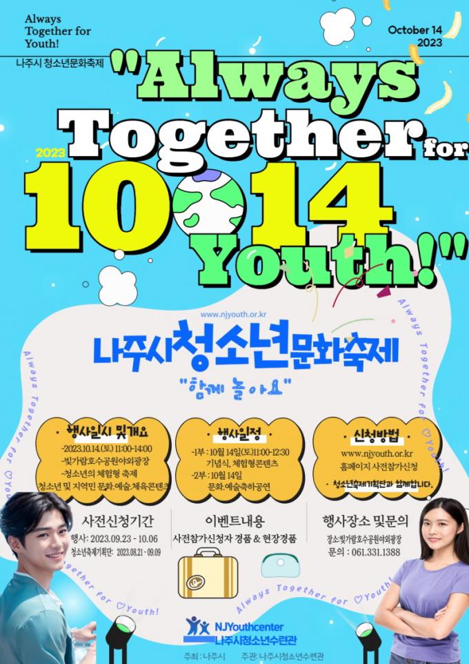 ³ªÁÖ½Ãû¼Ò³â¼ö·Ã°ü¿¡ µû¸£¸é û¼Ò³âµéÀÇ »î&»ýȰÀÇ ¾ðÁ¦³ª! ÇÔ²²!ÇÏ´Â Áö¼Ó°¡´ÉÇÑ Ã¼ÇèÇü ÃàÁ¦¸¦ Á¦°øÇÏ¿© û¼Ò³âµéÀÇ °Ç°ÇÑ ¼ºÀåÀ» Áö¿øÇϱâ À§ÇØ ¡°Always Together for youth!¡±(û¼Ò³âÀ» À§ÇØ Ç×»ó! ÇÔ²²!)¸¦ ÁÖÁ¦·Î ³ªÁÖ ºû°¡¶÷µ¿¿¡¼ ¿¸°´Ù.