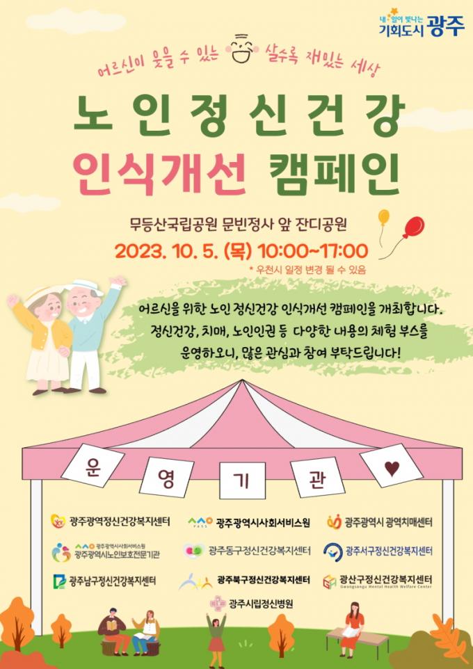 ±¤Áֽð¡ ÁÖÃÖÇÏ°í ±¤ÁÖ±¤¿ªÁ¤½Å°Ç°º¹Áö¼¾ÅÍ¡¤±¤ÁÖ±¤¿ª½Ã»çȸ¼ºñ½º¿øÀÌ ÁÖ°üÇÏ´Â ÇÕµ¿Ä·ÆäÀÎÀº 10¿ù 2ÀÏ ¡®³ëÀÎÀÇ ³¯¡¯À» ¸Â¾Æ ³ëÀÎ Á¤½Å°Ç° ÀÎ½Ä °³¼± ¹× Áö¿ª ³ëÀκ¹Áö¼ºñ½º È«º¸¸¦ À§ÇØ 5°³ ÀÚÄ¡±¸ Á¤½Å°Ç°º¹Áö¼¾ÅÍ, ±¤ÁÖ±¤¿ªÄ¡¸Å¼¾ÅÍ, ±¤ÁÖ³ëÀκ¸È£Àü¹®±â°ü, ±¤Áֽø³Á¤½Åº´¿ø µî 10°³ ±â°üÀÌ ÇÔ²² ÇÑ´Ù.