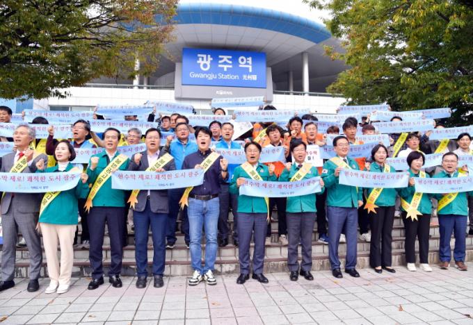 °±âÁ¤ ±¤ÁÖ½ÃÀåÀº ¡°°È°í ½ÍÀº ±¤ÁÖ¸¦ À§ÇØ Å« °á´ÜÀ» ÇØÁֽб¤ÁÖ½ÃÀÇȸ¿Í ´ëÇÑÁÖÅðǼ³Çùȸ, ¿Á¿Ü±¤°íÇùȸ¿¡ Áø½ÉÀ¸·Î °¨»çµå¸°´Ù¡±¸ç ¡°ºÒ¹ýÇö¼ö¸·Àº ½Ã¹ÎÀÇ ¾ÈÀüÀ» À§ÇùÇÏ°í µµ½ÉÀ» ȥŹÇÏ°Ô ¸¸µç´Ù. °È°í ½Í°í ±ú²ýÇÑ ±¤ÁÖ¸¦ ¸¸µé°íÀÚ ÇÏ´Â °á½ÉµéÀÌ ¸ð¿© ÀÌ ÀÚ¸®°¡ °¡´ÉÇß´Ù. ºÒ¹ýÇö¼ö¸· ±ÙÀý¿¡ Àúµµ ÃÖ¼±À» ´ÙÇϰڴ١±°í ¹àÇû´Ù.
