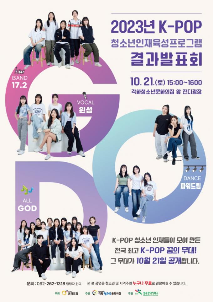 ¡®2023 K-POP û¼Ò³â ÀÎÀçÀ°¼º ÇÁ·Î±×·¥ °á°ú¹ßǥȸ¡¯´Â ¿À´Â 10¿ù 21ÀÏ(Åä) 15½ÃºÎÅÍ ±¤ÁÖ±¤¿ª½Ã°¢Èû¼Ò³â¹®ÈÀÇÁý Á¤¹® ¾Õ Àܵð±¤Àå¿¡¼ ÁøÇàµÇ¸ç, ´í½º¡¤º¸Ä᤹êµå °¢ ºÐ¾ßÀÇ ¹«´ë¿Í ±¤ÁÖ ÃÖÃÊÀÇ K-POP ÇÕµ¿ ÆÛÆ÷¸Õ½º°¡ ¿¹Á¤µÇ¾î ÀÖ´Ù.