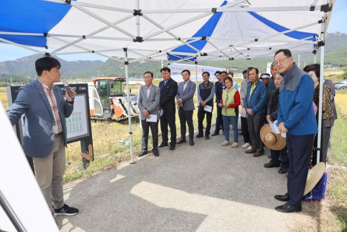 해남군은 18일 농림축산식품부 공모사업으로 선정된‘저탄소 벼 논물관리 기술보급 시범사업’사업대상지인 계곡면 방춘리 일원에서 벼수확과 함께 현장 설명회를 개최했다.
