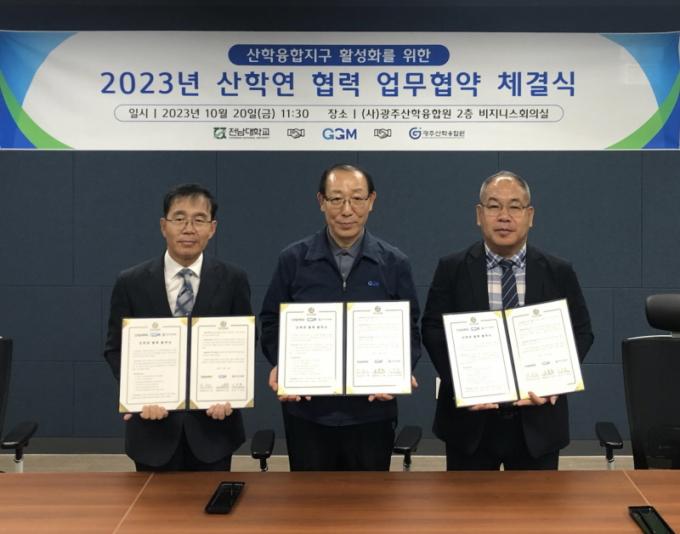 À̳¯ Çù¾à½Ä¿¡´Â °¢ ±â°ü ´ëÇ¥¸¦ ´ë½ÅÇØ ¹Ú±ÔÇØ Àü³²´ë ºû±×¸°»ê¾÷ÃßÁø´ÜÀå°ú ¿À¼øÃ¶ ±¤Áֱ۷ιú¸ðÅͽº º»ºÎÀå, ±×¸®°í ÀÌõȯ ±¤ÁÖ»êÇÐÀ¶ÇÕ¿øÀåÀÌ Âü¼®Çß´Ù.(»çÁø ¿ÞÂʺÎÅÍ)