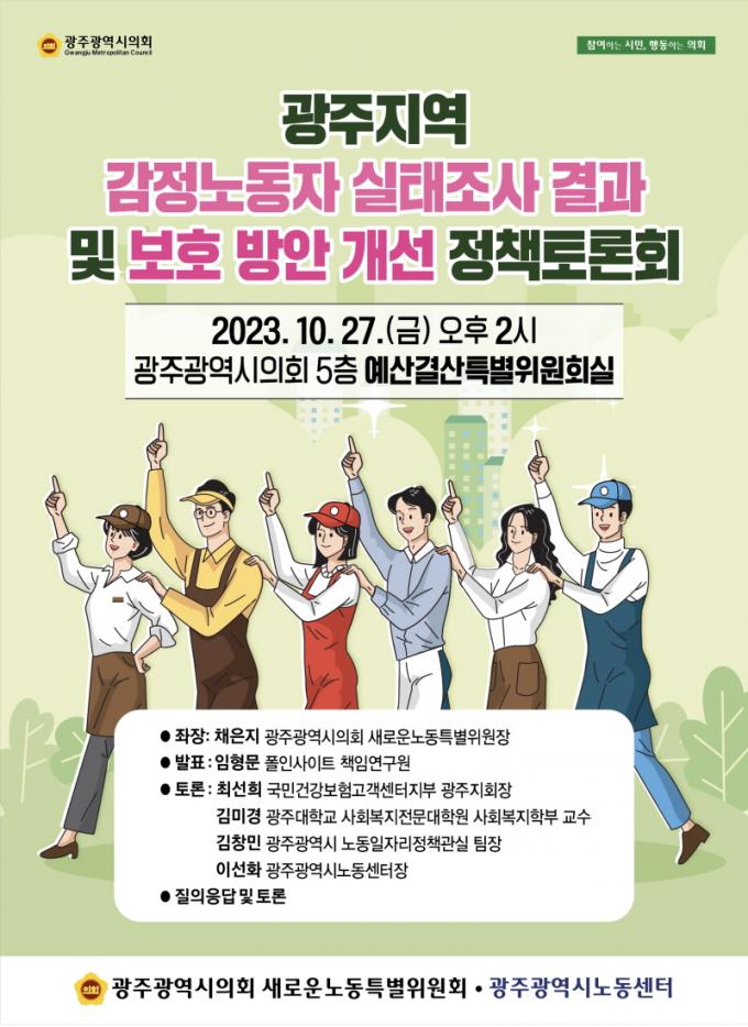 [È£³²´º½º¶óÀÎ = ¼ÀºÈ« ±âÀÚ] ±¤ÁÖ±¤¿ª½ÃÀÇȸ »õ·Î¿î³ëµ¿Æ¯º°À§¿øÈ¸(À§¿øÀå äÀºÁö, ÀÌÇÏ »õ³ëµ¿Æ¯À§)¿Í ±¤Áֳ뵿¼¾ÅÍ´Â 27ÀÏ(±Ý) ¿ÀÈÄ 2½Ã ½ÃÀÇȸ ¿¹»ê°á»êƯº°À§¿øÈ¸½Ç¿¡¼ ¡®±¤ÁÖÁö¿ª °¨Á¤³ëµ¿ÀÚ ½ÇÅÂÁ¶»ç °á°ú ¹× º¸È£ ¹æ¾È °³¼±¡¯¿¡ ´ëÇÑ Åä·Ðȸ¸¦ °³ÃÖÇÑ´Ù.