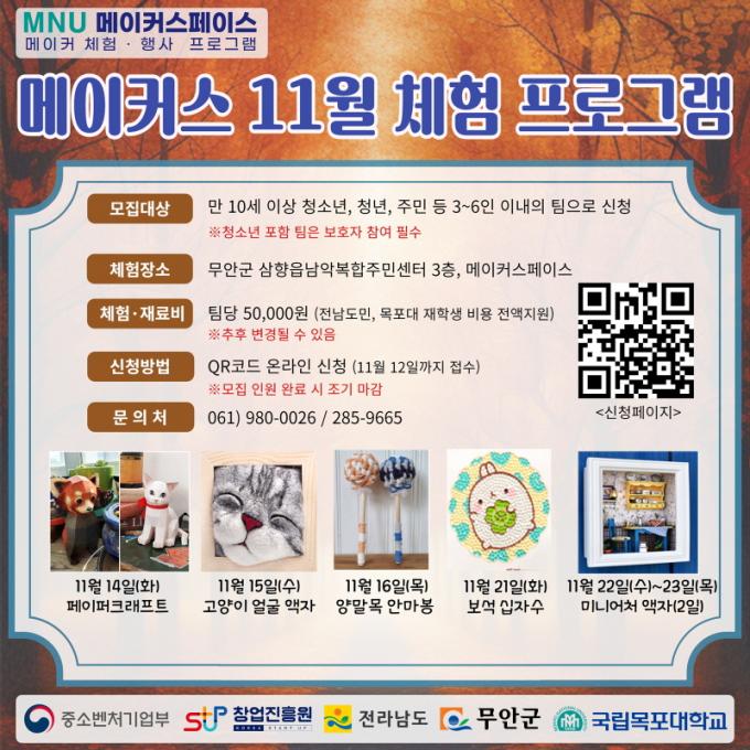 [È£³²´º½º¶óÀÎ = ¼ÀºÈ« ±âÀÚ] ¹«¾È±º(±º¼ö ±è»ê)Àº ±¹¸³¸ñÆ÷´ëÇб³ â¾÷Çõ½Å¼¾ÅÍ(¼¾ÅÍÀå À¯¿µÀç)¿¡¼ ¿î¿µÇÏ´Â MNU¸ÞÀÌÄ¿½ºÆäÀ̽º¿¡¼ 11¿ù ¸ÞÀÌÄ¿ üÇè ÇÁ·Î±×·¥À» ¿î¿µÇÑ´Ù°í ¹àÇû´Ù.