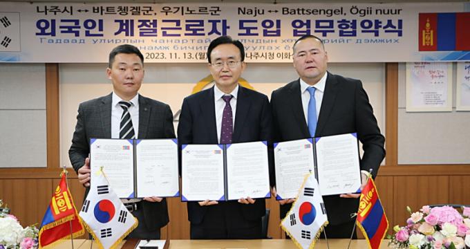 Àü¶ó³²µµ ³ªÁֽð¡ 13ÀÏ ¸ù°ñ ¹ÙÆ®Ãð֡¤¿ì±â³ë¸£±º(ÏÛ)°ú ¿Ü±¹ÀÎ °èÀý±Ù·ÎÀÚ µµÀÔ ¾÷¹«Çù¾àÀ» ü°áÇß´Ù. µÎ µµ½Ã´Â ³»³âºÎÅÍ ³ªÁֽà ³óÃÌ Áö¿ª¿¡ ¿Ü±¹ÀÎ °èÀý±Ù·ÎÀÚ¸¦ ÆÄ°ßÇÒ ¿¹Á¤ÀÌ´Ù. À±º´Å ³ªÁÖ½ÃÀå(°¡¿îµ¥), ÃÊÄí Á¶¸¯Äí¿ì ¹ÙÆ®Ãðֱº¼ö(¿À¸¥ÂÊ), »þ±×´Ù¸£ ¿ì¸£Â÷ÀÌÅ© ¿ì±â³ë¸£±º¼ö(¿ÞÂÊ)ÀÌ Çù¾à¼¿¡ ¼¸íÇÑ ÈÄ ±â³ä ÃÔ¿µÀ» Çϰí ÀÖ´Ù. (»çÁøÁ¦°ø-³ªÁÖ½Ã)
