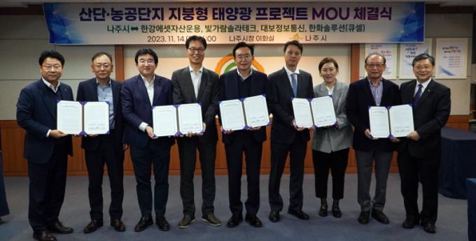 ³ªÁÖ½Ã(½ÃÀå À±º´ÅÂ)´Â Àü³¯ ½Ãû»ç ÀÌȽǿ¡¼ ÇѰ¿¡¼ÂÀÚ»ê¿î¿ë(ÁÖ), ´ëº¸Á¤º¸Åë½Å(ÁÖ), ÇÑȼַç¼Ç(ÁÖ), ºû°¡¶÷¼Ö¶óÅ×Å©(ÁÖ) µî 4°³»ç¿Í ¡®»ê´Ü¡¤³ó°ø´ÜÁö ÁöºØÇü ž籤 ÇÁ·ÎÁ§Æ®¡¯ ¾÷¹«Çù¾àÀ» ü°áÇß´Ù°í 15ÀÏ ¹àÇû´Ù. °ü³» 11°÷ »ê¾÷¡¤³ó°ø´ÜÁö ³» ÀÔÁÖ±â¾÷ÀÇ °øÀå ÁöºØ, ¿Á»ó¿¡ 5000¾ï¿ø´ë ¹Î°£ÀÚº» ÅõÀÚÀ¯Ä¡¸¦ ÅëÇØ 250¸Þ°¡¿ÍÆ®(MW)±Þ ž籤 ¹ßÀü½Ã¼³À» ±¸ÃàÇÒ ¹æÄ§ÀÌ´Ù. À±º´Å ³ªÁÖ½ÃÀå(°¡¿îµ¥)ÀÌ Çù¾à ¾÷ü ´ëÇ¥, °ü°èÀÚµé°ú ±â³äÃÔ¿µÀ» Çϰí ÀÖ´Ù. (»çÁøÁ¦°ø-³ªÁÖ½Ã)