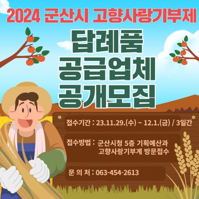 [È£³²´º½º¶óÀÎ = ¼ÀºÈ« ±âÀÚ] ±º»ê½Ã°¡ 2024³â °íÇâ»ç¶û±âºÎÁ¦ ´ä·Êǰ °ø±Þ¾÷ü¸¦ ¿À´Â 12¿ù 1ÀϱîÁö °ø°³¸ðÁý ÇÑ´Ù.