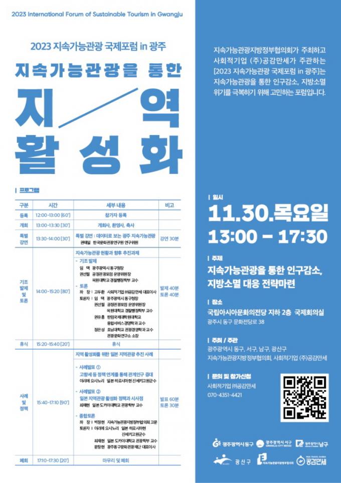 ¡®Áö¼Ó°¡´ÉÁö¹æÁ¤ºÎÇùÀÇȸ¡¯(»óÀÓȸÀå ÀÓÅÃ)¿Í ±¤ÁÖ µ¿±¸¡¤¼±¸¡¤³²±¸¡¤±¤»ê±¸°¡ °øµ¿ ÁÖÃÖÇÏ´Â À̹ø Æ÷·³Àº ¡®Áö¼Ó°¡´É°ü±¤À» ÅëÇÑ Áö¿ª Ȱ¼ºÈ¡¯¸¦ ÁÖÁ¦·Î Áö¼Ó°¡´É°ü±¤À» ¹ÙÅÁÀ¸·Î Àα¸°¨¼Ò¿Í Áö¹æ¼Ò¸ê À§±â¸¦ ±Øº¹Çϱâ À§ÇØ °í¹ÎÇÏ´Â ÀÚ¸®°¡ µÉ ¿¹Á¤ÀÌ´Ù.