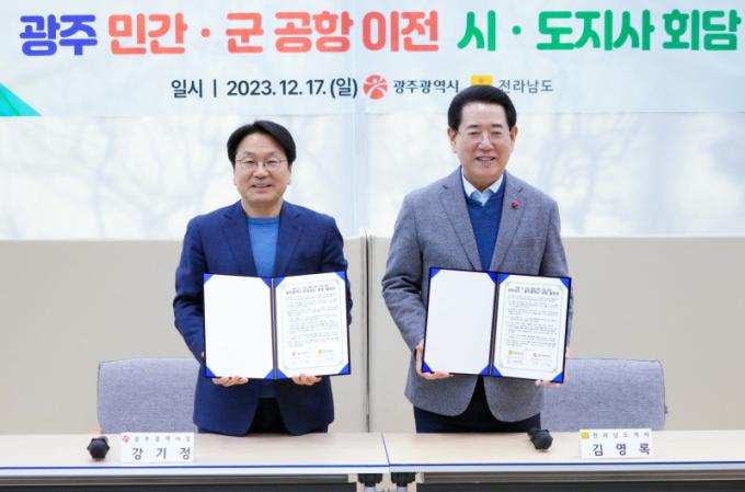 [È£³²´º½º¶óÀÎ = ¼ÀºÈ« ±âÀÚ] °±âÁ¤ ±¤ÁÖ±¤¿ª½ÃÀå°ú ±è¿µ·Ï Àü³²µµÁö»ç°¡ 17ÀÏ ¿ÀÈÄ Àü³² ³ªÁÖÇõ½Åµµ½Ã Çѱ¹³ó¼ö»ê½ÄǰÀ¯Åë°ø»ç(AT)¿¡¼ ¸¸³ª ±¤ÁÖ ±º¡¤¹Î°£ °øÇ× ÀÌÀü ÃßÁø°ú °ü·ÃÇÑ ³íÀǸ¦ ¸¶Ä£ µÚ °øµ¿¹ßÇ¥¹®À» ¹ßÇ¥Çß´Ù.