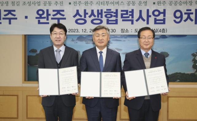 ÀüºÏµµ´Â 26ÀÏ µµÃ» ȸÀǽǿ¡¼ ±è°ü¿µ µµÁö»ç¸¦ ºñ·ÔÇØ ¿ì¹ü±â ÀüÁÖ½ÃÀå°ú À¯ÈñÅ ¿ÏÁÖ±º¼ö°¡ Âü¼®ÇÑ °¡¿îµ¥ ¡®ÀüÁÖ¡¤¿ÏÁÖ »ó»ýÇù·Â»ç¾÷ 9Â÷ Çù¾à½Ä¡¯À» °¡Á³´Ù°í ¹àÇû´Ù. À̹ø 9Â÷ Çù¾à¿¡¼ ÃßÁøÇϱâ·Î ÇÑ »ç¾÷Àº ¸ÕÀú ¡®¿ÏÁÖ¡¤ÀüÁÖ »ó»ýö±æ Á¶¼º¡¯ »ç¾÷ °øµ¿ÃßÁøÀÌ´Ù.