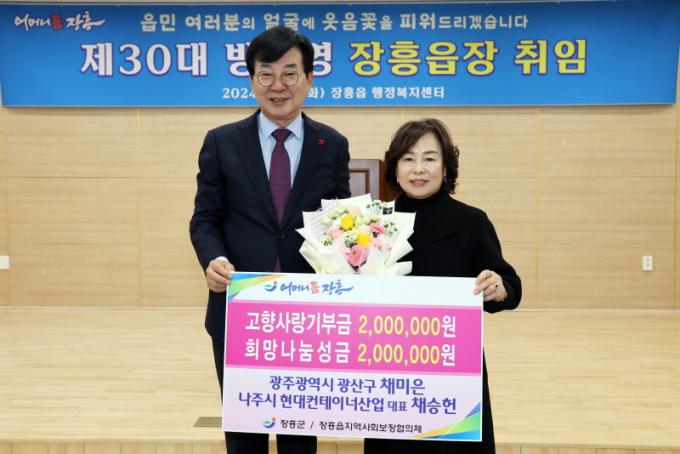 [È£³²´º½º¶óÀÎ = ¼ÀºÈ« ±âÀÚ] 2ÀÏ ¹æÁö¿µ ÀåÈïÀ¾Àå ÃëÀӽĿ¡¼ ±¤ÁÖ±¤¿ª½Ã ±¤»ê±¸ ä¹ÌÀº°ú ³ªÁֽà Çö´ëÄÁÅ×À̳ʻê¾÷ ´ëÇ¥ ä½ÂÇå ³²¸Å°¡ ÀåÈïÀ¾¿¡ °íÇâ»ç¶û±âºÎ±Ý°ú ÀÌ¿ôµ½±â ¼º±Ý °¢ 200¸¸¿øÀ» ±âŹÇß´Ù°í ¹àÇû´Ù.