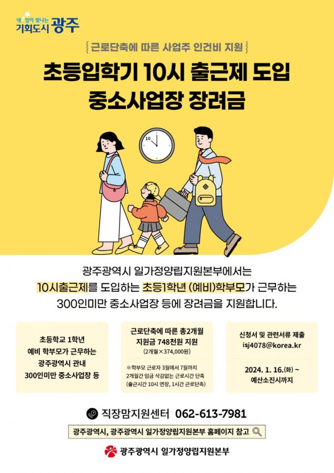 ±¤Áֽà Àϰ¡Á¤ ¾ç¸³ Áö¿øÁ¤Ã¥ÀÎ ¡®Ãʵî1Çгâ Çкθð 10½Ã Ãâ±ÙÁ¦ µµÀÔ Áß¼Ò»ç¾÷Àå Àå·Á±Ý Áö¿ø »ç¾÷¡¯Àº 300ÀÎ ¹Ì¸¸ Áß¼Ò»ç¾÷Àå¿¡¼ ±Ù¹«ÇÏ´Â Ãʵî 1Çгâ Çкθð ±Ù·ÎÀÚ°¡ ÀÔÇбâ(3~7¿ù)¿¡ ÃÖ´ë 2°³¿ù°£ Ãâ±Ù½Ã°£À» 1½Ã°£ ´ÊÃâ ¼ö ÀÖµµ·Ï Áö¿øÇÏ´Â »ç¾÷ÀÌ´Ù.