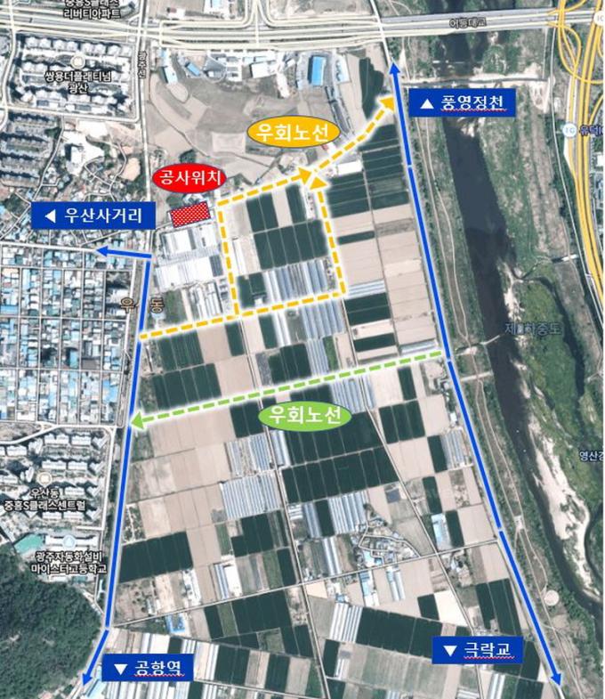 ÀÌ¿¡ µû¶ó ÇØ´ç ±¸°£ Â÷·® ÁøÀÔÀÌ ¾î·Á¿ö ¿ìÈ¸ÇØ¾ß ÇÑ´Ù. ±¤ÁÖ»ó¼öµµ»ç¾÷º»ºÎ´Â °ø»ç Á¾·á±îÁö Â÷·®½ÅÈ£¼ö¿Í ¾È³»°£ÆÇ µîÀ» ¹èÄ¡ÇØ ±³ÅëºÒÆí µîÀ» ÃÖ¼ÒÈÇÒ ¹æÄ§ÀÌ´Ù.