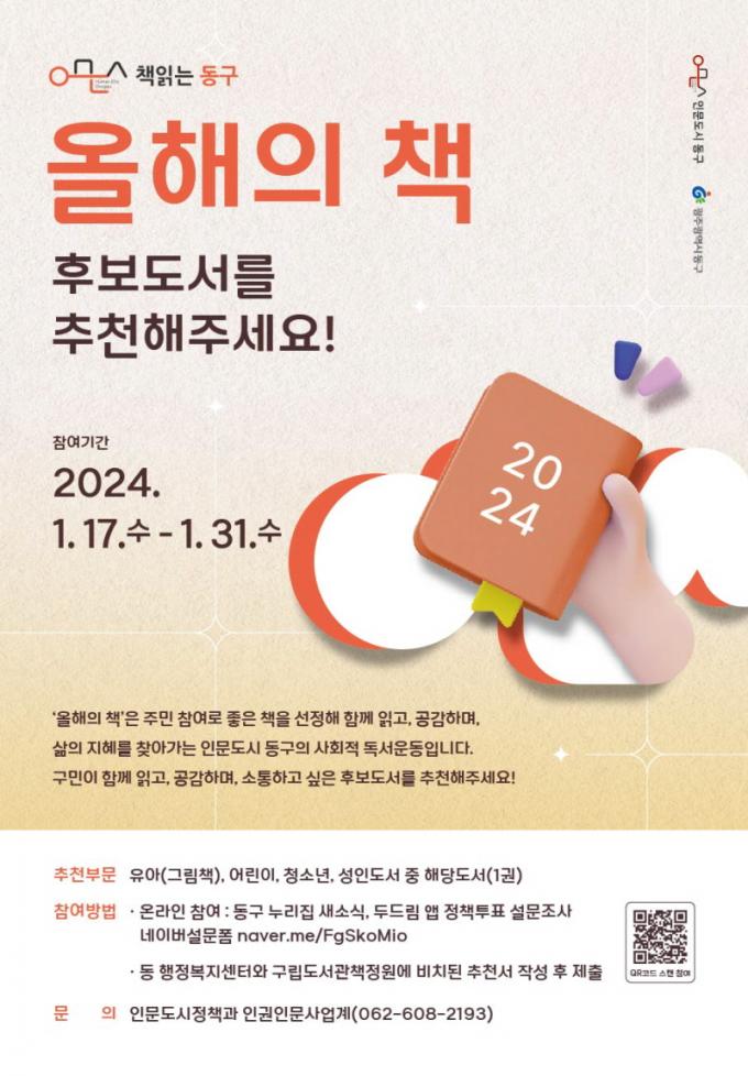 [È£³²´º½º¶óÀÎ = ¼ÀºÈ« ±âÀÚ] ±¤Áֽà µ¿±¸(ûÀå ÀÓÅÃ)´Â Áö¿ª¹Î°ú ÇÔ²² ÀÐÀ» ¡®2024 ¿ÃÇØÀÇ Ã¥¡¯ ¼±Á¤À» À§ÇÑ Èĺ¸ µµ¼ Ãßõ ¼³¹®Á¶»ç¸¦ ¿À´Â 31ÀϱîÁö Á¢¼ö¹Þ´Â´Ù°í ¹àÇû´Ù.
