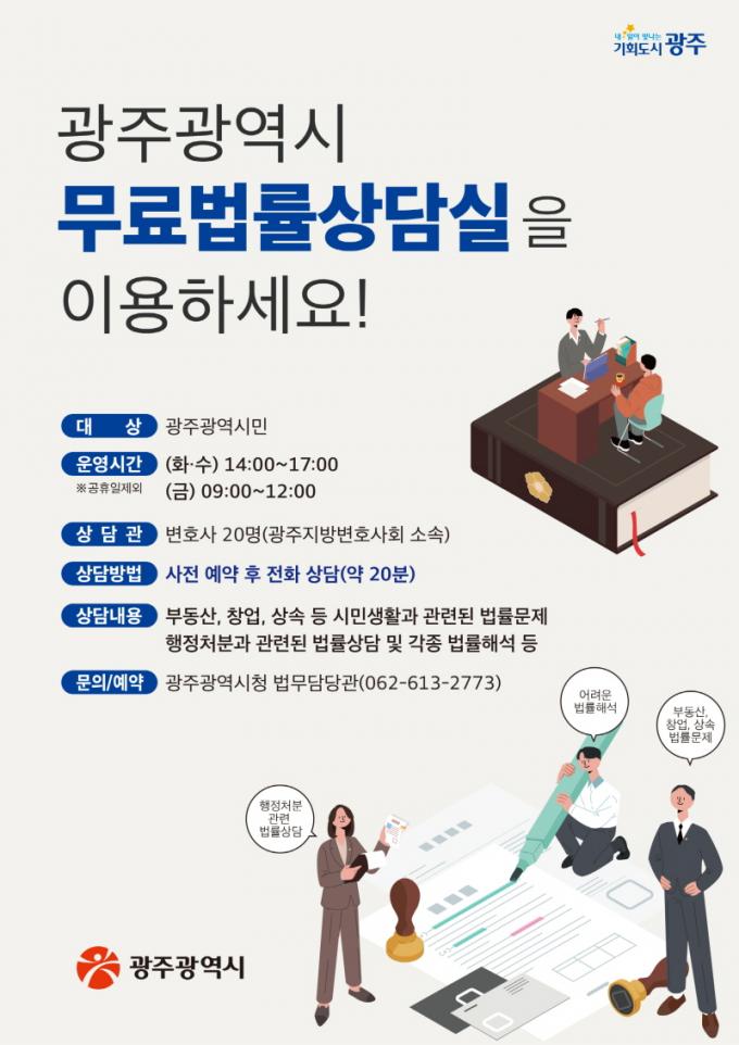 [È£³²´º½º¶óÀÎ = ¼ÀºÈ« ±âÀÚ] ±¤ÁÖ±¤¿ª½Ã(½ÃÀå °±âÁ¤)°¡ »ýȰ ¼Ó ¹ý·ü µµ¿òÀÌ ÇÊ¿äÇÑ ½Ã¹ÎµéÀ» À§ÇØ ¿î¿µÇÏ´Â ¹«·á¹ý·ü»ó´ã½ÇÀ» 2¿ùºÎÅÍ È®´ë ½ÃÇàÇÑ´Ù.