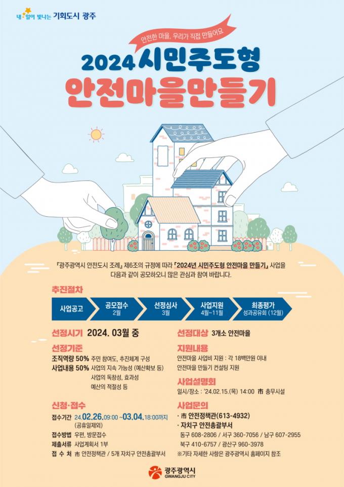 [È£³²´º½º¶óÀÎ = ¼ÀºÈ« ±âÀÚ] ±¤ÁÖ±¤¿ª½Ã(½ÃÀå °±âÁ¤)´Â ¡®2024³âµµ ½Ã¹ÎÁÖµµÇü ¾ÈÀü¸¶À» ¸¸µé±â Áö¿ø»ç¾÷¡¯¿¡ Âü¿©ÇÒ ÁÖ¹ÎÇùÀÇü¸¦ ¿À´Â 26ÀϺÎÅÍ 3¿ù4ÀϱîÁö °ø°³¸ðÁýÇÑ´Ù.
