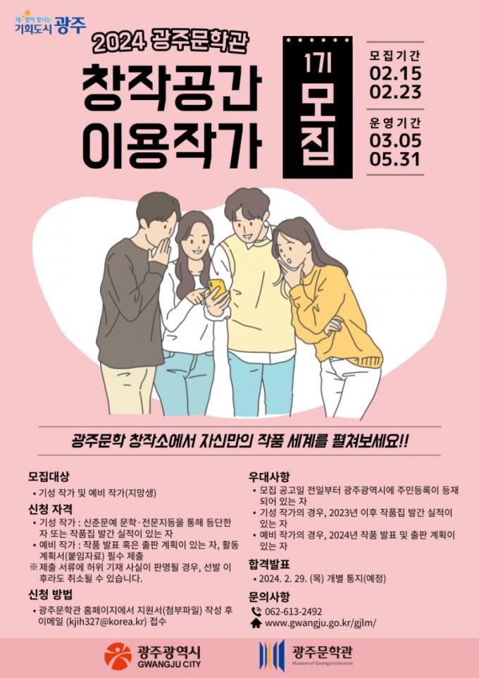 [È£³²´º½º¶óÀÎ = ¼ÀºÈ« ±âÀÚ] ±¤ÁÖ¹®ÇаüÀº ±â¼º ÀÛ°¡¿Í ¿¹ºñ ÀÛ°¡ÀÇ ÀÛǰ âÀÛÀ» Áö¿øÇϱâ À§ÇØ ¡®2024³â Á¦1±â âÀÛ°ø°£ ÁýÇÊ ÀÛ°¡¡¯¸¦ ¸ðÁýÇÑ´Ù.