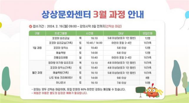 ¿ÃÇØ »ó»ó¹®È¼¾ÅÍ´Â »ó‧ÇϹݱ⿡ ¡®²¿²¿¸¶ ¿ä¸®±³½Ç¡¯, ¡®²¿²¿¸¶ âÀÛ¼Ò¡¯ µîÀÇ 1ÀÏ °úÁ¤, ¡®³ªµµ ¹æ¼Û Å©¸®¿¡ÀÌÅÍ¡¯, ¡®¾ö¸¶¶û ¾Æ±â¶û ¿ä¸®Á¶¸®¡¯ µîÀÇ ¿ù°£°úÁ¤À» ¿î¿µÇϰí, ½Ã±âº°·Î ¿©¸§¹æÇÐÆ¯°(7~8¿ù)°ú ±èÀ寝°(10~11¿ù)µµ ¿î¿µÇÒ °èȹÀÌ´Ù.