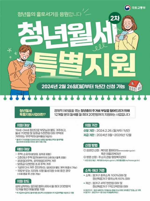 À̹ø 2Â÷ »ç¾÷Àº û¾àÅëÀå °¡ÀÔÀÌ ÇʼöÁ¶°ÇÀ¸·Î Ãß°¡µÆÀ¸¸ç, ±âÁ¸ 1Â÷ »ç¾÷ ¶Ç´Â ÁöÀÚü »ç¾÷¿¡¼ ¿ù¼¼¸¦ Áö¿ø¹ÞÀº û³âµµ Áö¿ø Á¾·á ÈÄ 2Â÷ »ç¾÷¿¡ ½ÅûÀÌ °¡´ÉÇÏ´Ù.Áö¿ø ´ë»óÀº ºÎ¸ð¿Í º°µµ °ÅÁÖÇÏ´Â 19~34¼¼ ¹«ÁÖÅà û³âÀ¸·Î, º¸Áõ±Ý 5õ¸¸¿ø ÀÌÇÏ, ¿ù¼¼ 70¸¸¿ø ÀÌÇÏÀÎ ÁÖÅÿ¡ °ÅÁÖÇØ¾ß ÇÑ´Ù.