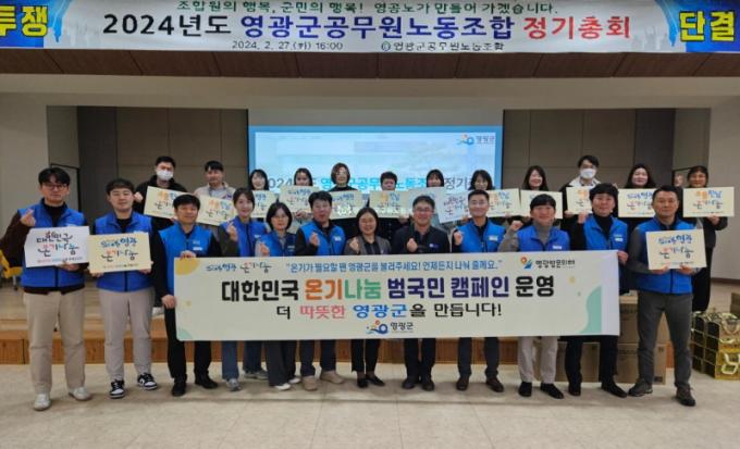 [È£³²´º½º¶óÀÎ = ¼ÀºÈ« ±âÀÚ] ¿µ±¤±º°ø¹«¿ø³ëµ¿Á¶ÇÕ(À§¿øÀå Á¶¹ü±â)Àº Áö³ 27ÀÏ ¿µ±¤±ºÃ» 3Ãþ ´ëȸÀǽǿ¡¼ 300¿© ¸íÀÇ Á¶ÇÕ¿øÀÌ Âü¼®ÇÑ °¡¿îµ¥ 2024³âµµ Á¤±âÃÑȸ¸¦ ¿°í ¿µ±¤±º(±º¼ö °Á¾¸¸)¿¡¼ ÃßÁø ÁßÀÎ ¿Â±â³ª´® ¸±·¹ÀÌ Ä·ÆäÀο¡ µ¿ÂüÇÏ¿´´Ù.