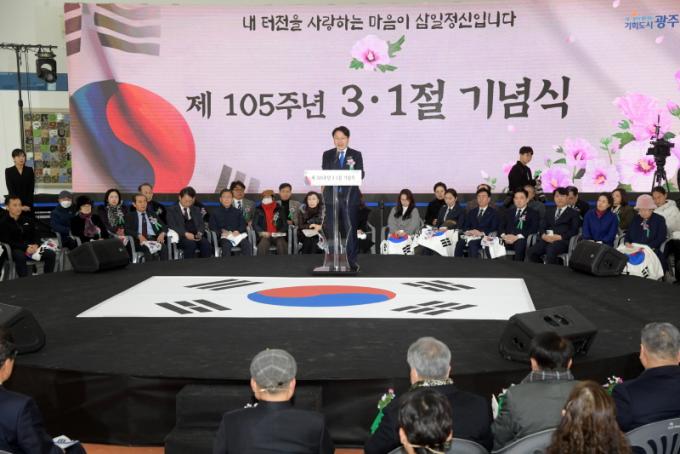 [È£³²´º½º¶óÀÎ = ¼ÀºÈ« ±âÀÚ] °±âÁ¤ ±¤ÁÖ±¤¿ª½ÃÀåÀº 1ÀÏ Á¦105ÁÖ³â 3‧1Àý ±â³ä½Ä¿¡¼ ¡°3‧1¿îµ¿Àº ÀÏÁ¦¿¡ »©¾Ñ±ä ÁÖ±ÇÀ» µÇãÀ¸·Á´Â ÁÖ±Çȸº¹¿îµ¿À̾ú´Ù¡±¸é¼ ¡°2024³â ¿À´ÃÀÇ 3¡¤1¿îµ¿Àº ¼öµµ±Ç¿¡ »©¾Ñ±ä Áö¹æÀÇ ÀÏÅÍ‧³îÀÌÅÍ‧¹è¿òÅ͸¦ µÇã´Â ȸº¹¿îµ¿À̾î¾ß ÇÑ´Ù. ³» ÅÍÀüÀ» »ç¶ûÇÏ´Â ¸¶À½ÀÌ °ð 3‧1Á¤½ÅÀÌ´Ù¡±°í ¸»Çß´Ù.