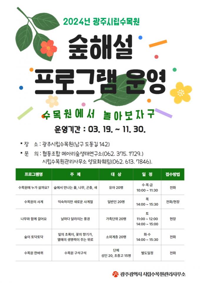 ƯÈ÷ ±¤Áֽø³¼ö¸ñ¿øÀº ¿¬·É°ú °èÀýº°·Î ´Ù¾çÇÑ ÇÁ·Î±×·¥À» ¼±º¸ÀδÙ. À¯¾Æ¸¦ ´ë»óÀ¸·Î´Â ¡ã¼ö¸ñ¿ø¿¡ ´©°¡ »ì±î¿ä?¸¦, ÀϹÝÀΰú °¡Á· ´ë»óÀ¸·Î ¡ã¼ö¸ñ¿øÀÇ »ç°è ¡ã³ª¹«¿Í ÇÔ²² °É¾î¿ä µîÀ» °³¼³ÇÑ´Ù. Àå¾ÖÀÎ µî Ãë¾à°èÃþÀ» À§ÇÑ ¡ã½£ÀÌ Åä´ÚÅä´Ú ÇÁ·Î±×·¥µµ ¸¶·ÃÇß´Ù. ¸ðµç ÇÁ·Î±×·¥Àº ¹«·á·Î ÁøÇàµÈ´Ù.