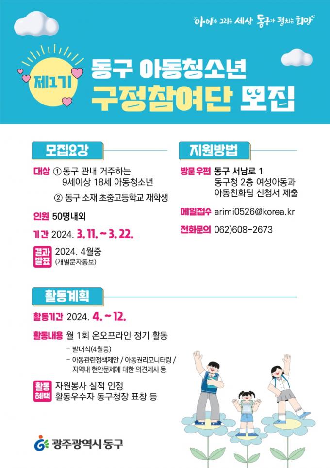 [È£³²´º½º¶óÀÎ = ¼ÀºÈ« ±âÀÚ] ±¤ÁÖ µ¿±¸(ûÀå ÀÓÅÃ)´Â ¾Æµ¿ÀÇ Âü¿©±Ç º¸Àå°ú ¹ÎÁÖ ½Ã¹Î ÀÇ½Ä ÇÔ¾çÀ» À§ÇÑ ¡®µ¿±¸ ¾Æµ¿¡¤Ã»¼Ò³â ±¸Á¤ Âü¿©´Ü¡¯À» ¿À´Â 22ÀϱîÁö ¸ðÁýÇÑ´Ù°í ¹àÇû´Ù.