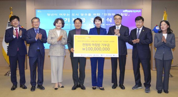 ±¤ÁÖ±¤¿ª½Ã(½ÃÀå °±âÁ¤)´Â 18ÀÏ ½Ãû ºñÁî´Ï½º·ë¿¡¼ °±âÁ¤ ½ÃÀå, ³ëÇöÁÖ KB±¹¹ÎÀºÇà È£³²Áö¿ª±×·ì´ëÇ¥, ±èº´ÀÎ Àü³²´ë ºÎÃÑÀå, ÀüÁ¦¿ Á¶¼±´ë ºÎÃÑÀå, ¹Ú»óö È£³²´ë ÃÑÀå, À̼±Àç ±¤ÁÖ¿©´ë ÃÑÀå, ¼Û¹Ì·É ±¤ÁÖ°úÇбâ¼ú¿ø ÇлýóÀå µîÀÌ Âü¼®ÇÑ °¡¿îµ¥ ¡®Ãµ¿øÀÇ ¾ÆÄ§¹ä ±âºÎ±Ý Àü´Þ½Ä¡¯À» °¡Á³´Ù.