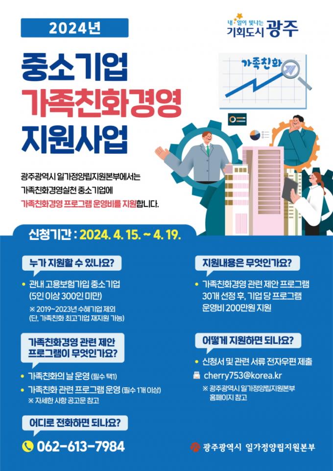 [È£³²´º½º¶óÀÎ = ¼ÀºÈ« ±âÀÚ] ±¤ÁÖ±¤¿ª½ÃÀϰ¡Á¤¾ç¸³Áö¿øº»ºÎ´Â Áß¼Ò±â¾÷ÀÌ °¡Á·Ä£È°æ¿µÀ» µµÀÔÇÒ ¼ö ÀÖµµ·Ï ¡®2024³â Áß¼Ò±â¾÷ °¡Á·Ä£È°æ¿µ Áö¿ø »ç¾÷¡¯¿¡ Âü¿©ÇÒ ±â¾÷À» °ø¸ðÇÑ´Ù.