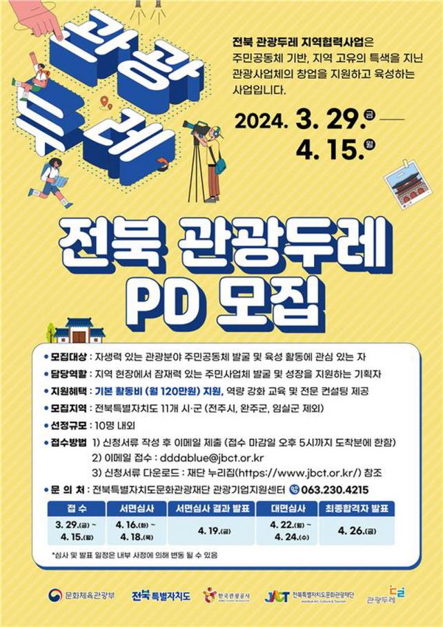 [È£³²´º½º¶óÀÎ = ¼ÀºÈ« ±âÀÚ] ÀüºÏƯº°ÀÚÄ¡µµ¹®È°ü±¤Àç´Ü(´ëÇ¥ÀÌ»ç À̰æÀ±, ÀÌÇÏ Àç´Ü)¿Í ÀüºÏƯº°ÀÚÄ¡µµ(ÀÌÇÏ ÀüºÏÀÚÄ¡µµ)´Â Áö¿ª°ü±¤À» Ȱ¼ºÈÇϱâ À§ÇØ ÀüºÏ °ü±¤µÎ·¹ PD(ÀÌÇÏ PD)¸¦ 4¿ù 15ÀϱîÁö 10¸í ³»¿Ü¸¦ ¸ðÁýÇÑ´Ù.