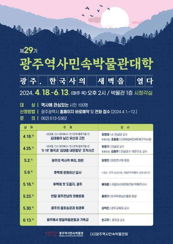 ¹Ú¹°°ü´ëÇÐ °Á´ ¹«·á·Î ÁøÇàµÇ¸ç, ¼ö°½ÅûÀº 1ÀϺÎÅÍ ±¤Áֽà ´©¸®Áý ¹Ù·Î¿¹¾à(http://www.gwangju.go.kr/gjhfm)¿¡¼ °¡´ÉÇÏ´Ù.(¼±Âø¼ø 100¸í) ÀÚ¼¼ÇÑ ³»¿ëÀº ±¤ÁÖ¿ª»ç¹Î¼Ó¹Ú¹°°ü(062-613-5362)À¸·Î ÇÏ¸é µÈ´Ù.