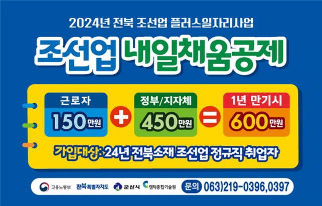 ¡®ÀüºÏ Á¶¼±¾÷ ³»ÀÏä¿ò°øÁ¦¡¯ »ç¾÷Àº 2024³â 1¿ù 1ÀÏ ÀÌÈÄ µµ³» Á¶¼±¾÷ ±â¾÷ü¿¡ ½Å±Ô ÀÔ»çÇÑ ±Ù·ÎÀÚ¸¦ ´ë»óÀ¸·Î, ±Ù·ÎÀÚ°¡ 1³â°£ ¿ù 12¸¸ 5õ¿ø ÃÑ 150¸¸¿øÀ» Àû¸³Çϸé Á¤ºÎ¿Í ÁöÀÚü°¡ 450¸¸¿øÀ» Áö¿øÇÏ´Â ¼Òµæº¸Àü °øÁ¦»ç¾÷ÀÌ´Ù. ±Ù·ÎÀÚ´Â À̸¦ ÅëÇØ ÃÑ 600¸¸¿øÀ» ¹Þ´Â´Ù.