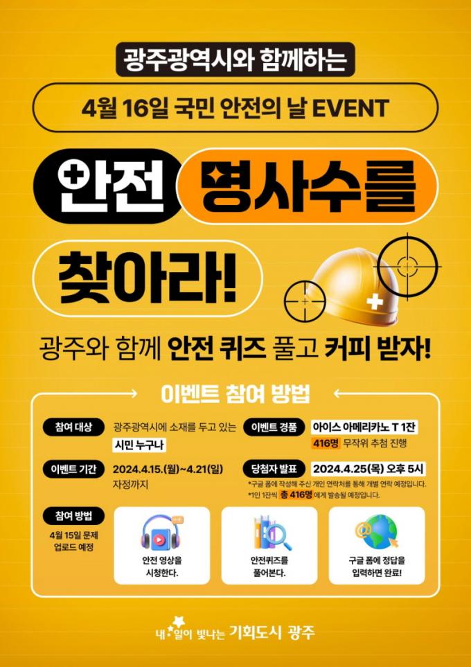 À̹ø À̺¥Æ®´Â 4¿ù 16ÀÏ ±¹¹Î¾ÈÀüÀÇ ³¯À» ¸Â¾Æ ±¹¹Î¾ÈÀüÁÖ°£(4¿ù 15~21ÀÏ)¿¡ ±¤Áֽà ´©¸®Áý ¾Ë¸²Ã¢ ¡®¾ÈÀü ¸í»ç¼ö¸¦ ã¾Æ¶ó!¡¯¸¦ ÅëÇØ ±¤ÁֽùξÈÀüº¸Çè°ú ±³Åë»ç°í ¿¹¹æ Ä·ÆäÀÎ µ¿¿µ»óÀ» º¸°í °ü·Ã ¹®Á¦¸¦ Ç®¾î ±¸±Û Æû¿¡ ´äÀ» ÀÔ·ÂÇÏ¸é µÈ´Ù.
