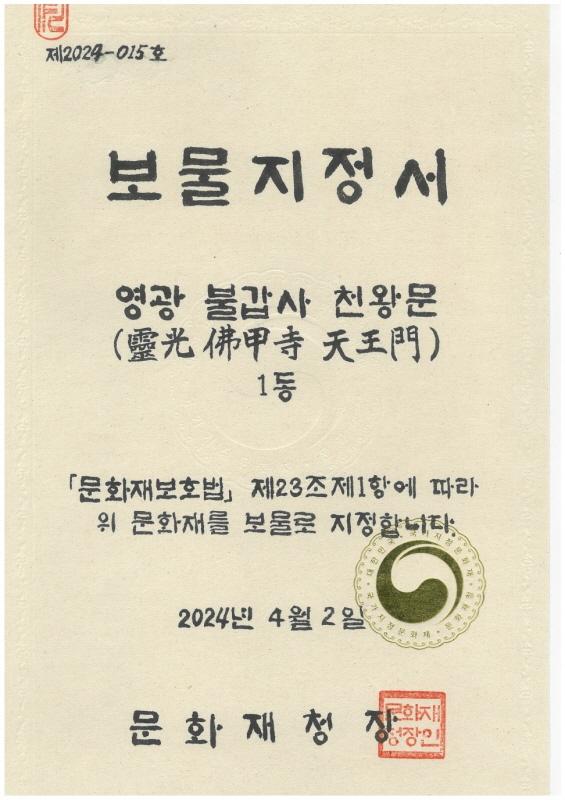 [È£³²´º½º¶óÀÎ = ¼ÀºÈ« ±âÀÚ] ¡®¿µ±¤ ºÒ°©»ç õ¿Õ¹®¡¯ÀÌ 2024³â 4¿ù 2ÀÏÀÚ·Î ±¹°¡ÁöÁ¤À¯»ê º¸¹°·Î ÁöÁ¤µÇ¾ú´Ù.