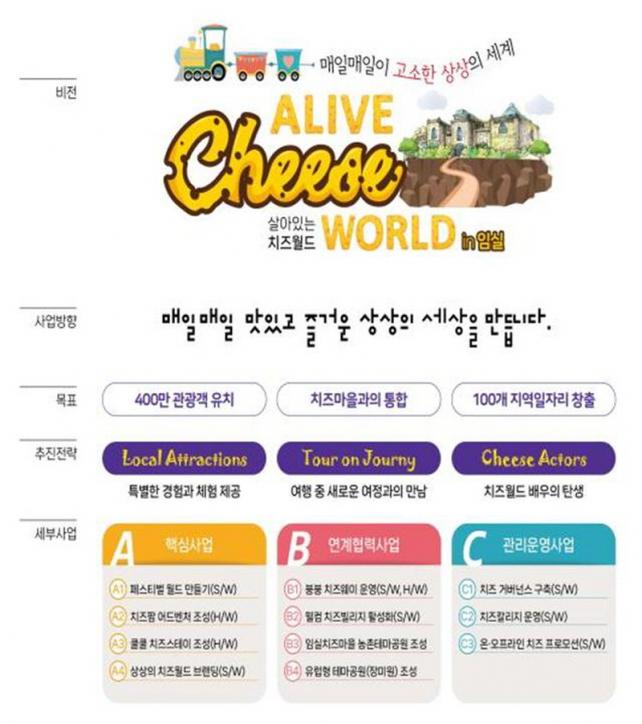 ¡®¡¯¸ÅÀϸÅÀÏÀÌ °í¼ÒÇÑ »ó»óÀÇ ¼¼°è Alive Cheese World in Àӽǡ° À̶ó´Â ÁÖÁ¦·Î ¼±Á¤µÈ º» »ç¾÷Àº ±¹³» À¯ÀÏÀÇ Ä¡ÁîÅ׸¶ÆÄÅ©¿Í Àα٠ġÁÀ», ³óÃÌÅ׸¶°ø¿ø, À¯·´Çü Àå¹Ì¿øÀ» À¯±âÀûÀ¸·Î ¿¬°èÇÑ ¡±Ä¡Áî¿ùµå¡°·Î È®ÀåÇϰí ÅëÇÕÀûÀ̰í ü°èÀûÀÎ ¿î¿µÀ» ÅëÇØ ¸ÅÀϸÅÀÏ È°·ÂÀÌ ³ÑÄ¡´Â °ü±¤°ÅÁ¡À¸·Î °Åµì³ª Àα¸°¨¼Ò Áö¿ª¿¡ Ȱ·ÂÀ» ºÒ¾î ³Ö´Â´Ù´Â °èȹÀÌ´Ù.