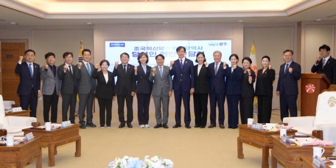 À̳¯ °£´ãȸ¿¡´Â °±âÁ¤ ½ÃÀåÀ» ºñ·ÔÇØ Á¶±¹Çõ½Å´ç Á¶±¹ ´ëÇ¥¿Í ¹ÚÀºÁ¤¡¤ÀÌÇØ¹Î¡¤½ÅÀå½Ä¡¤±è¼±¹Î¡¤±èÀç¿ø¡¤Á¤Ãá»ý¡¤Â÷±Ô±Ù¡¤°°æ¼÷¡¤¼¿ÕÁø ±¹È¸ÀÇ¿ø ´ç¼±ÀÎ, Àº¿ì±Ù ±¤ÁֽôçÀ§¿øÀå µîÀÌ Âü¼®Çß´Ù. Á¶ ´ëÇ¥°¡ ±¤ÁÖ½ÃûÀ» ãÀº °ÍÀº Áö³´Þ 14ÀÏ¿¡ ÀÌ¾î µÎ ¹øÂ°·Î, Á¦22´ë ±¹È¸ °³¿øÀ» ¾ÕµÎ°í ´ç Â÷¿øÀÇ Áö¿ªÇö¾È ÇØ°á Áö¿ø ¹æ¾ÈÀ» »çÀü¿¡ ³íÀÇÇϱâ À§ÇÑ ÀÚ¸®´Ù.