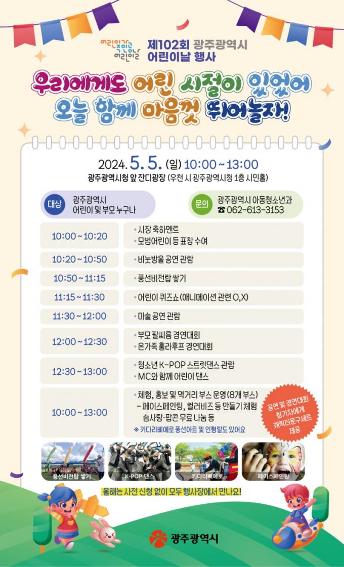 [È£³²´º½º¶óÀÎ = ¼ÀºÈ« ±âÀÚ] ±¤ÁÖ±¤¿ª½Ã(½ÃÀå °±âÁ¤)´Â Á¦102ȸ ¾î¸°À̳¯À» ¸Â¾Æ ¿À´Â 5¿ù 5ÀÏ ¿ÀÀü 10½Ã ½Ãû ¾Õ Àܵð±¤Àå(¿ìõ ¶§ ½Ãû ½Ã¹ÎȦ)¿¡¼ ¾î¸°À̳¯ Çà»ç¸¦ °³ÃÖÇÑ´Ù.