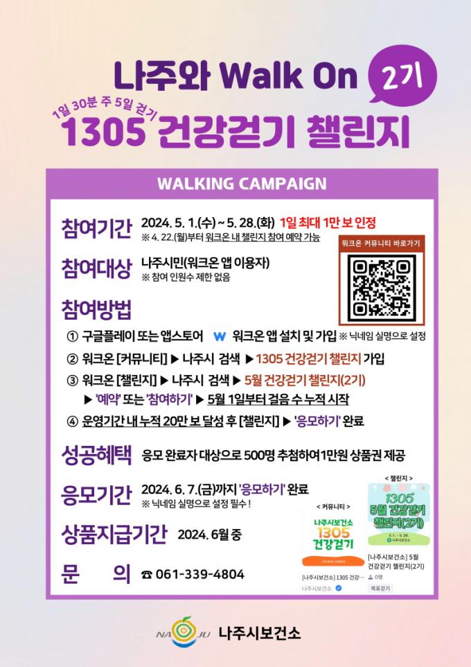 ¡®1305¡¯´Â ÇÏ·ç¿¡(1) 30ºÐ¾¿(30) ÁÖ 5ÀÏ(5) °È´Â´Ù´Â ¶æÀ» ´ã°í ÀÖ´Ù. 5¿ù 1ÀϺÎÅÍ 5¿ù 28ÀϱîÁö 4ÁÖ°£ 20¸¸ º¸¸¦ ´Þ¼ºÇÏ¸é »óǰ±Ç Ãß÷¿¡ ÀÀ¸ðÇÒ ¼ö ÀÖ´Ù.