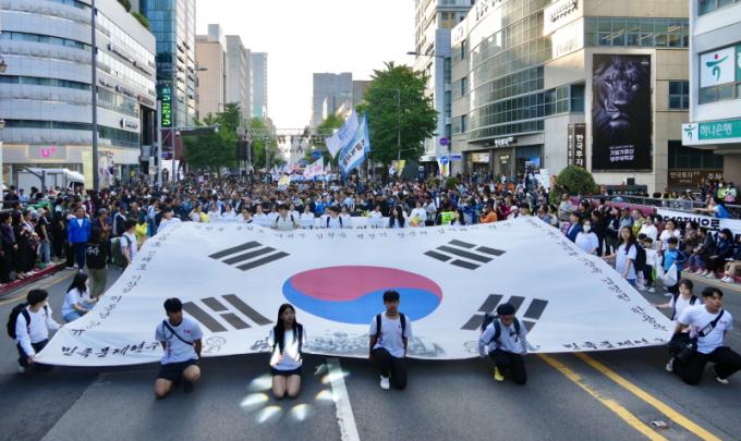 [È£³²´º½º¶óÀÎ = ¼ÀºÈ« ±âÀÚ] °±âÁ¤ ±¤ÁÖ±¤¿ª½ÃÀå°ú 5°³ ÀÚÄ¡±¸ ûÀå, ±¹È¸ÀÇ¿ø, ´ëÇлý, ½Ã¹Î µî 5000¿©¸íÀÌ 17ÀÏ ¿ÀÈÄ 1980³â 5¿ù ¹ÎÁ·¹ÎÁÖȴ뼺ȸ¸¦ ÀçÇöÇÏ´Â ¹ÎÁÖÆòÈ´ëÇàÁø¿¡ Âü°¡Çß´Ù.