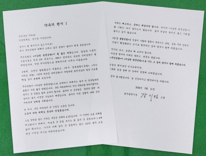 °±âÁ¤ ±¤ÁÖ±¤¿ª½ÃÀåÀº 21ÀÏ ¡°¹«¾È°øÇ׿¡ ´ëÇØ µå¸®°í ½ÍÀº ¸»¾¸ÀÌ ¸¹¾Æ ÆæÀ» µé¾ú´Ù¡±¸ç ¹«¾È±º¹Î¿¡°Ô µå¸®´Â ¡®¾à¼ÓÀÇ ÆíÁö1¡¯¸¦ ¶ç¿ü´Ù.