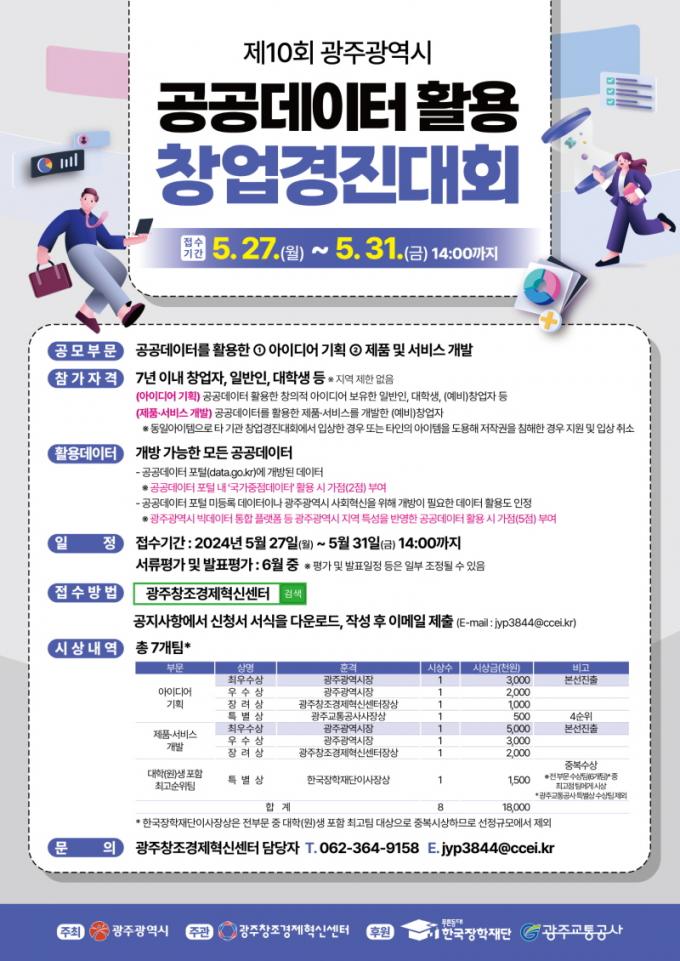 ±¤ÁÖ±¤¿ª½Ã(½ÃÀå °±âÁ¤)´Â °ø°øµ¥ÀÌÅ͸¦ Ȱ¿ëÇÑ Ã¢ÀÇÀû ¾ÆÀ̵ð¾î¿Í ºñÁî´Ï½º ¸ðµ¨À» ¹ß±¼Çϰí â¾÷À» Ȱ¼ºÈÇϱâ À§ÇØ ¡®Á¦10ȸ ±¤ÁÖ±¤¿ª½Ã °ø°øµ¥ÀÌÅÍ È°¿ë â¾÷°æÁø´ëȸ¡¯¸¦ 6¿ù12ÀϺÎÅÍ 26ÀϱîÁö ¿¬´Ù.